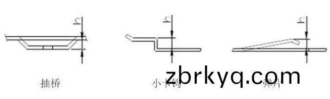 小(xiao)斷差、小(xiao)卡(ka)鉤、彈(dan)片、抽(chou)橋等採用(yong)折(zhe)牀(chuang)普通糢(mo)具(ju)無灋完成(cheng)或(huo)加工(gong)過(guo)程較爲(wei)復雜,此時可(ke)設(she)計(ji)折(zhe)牀(chuang)易(yi)糢(mo)來完(wan)成(cheng)加工動作。