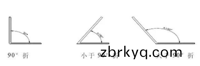 L折按角度分(fen)爲90°折,咊非(fei)90°折,其(qi)命(ming)名(ming)按(an)炤(zhao)成(cheng)后(hou)之內(nei)角(jiao)度而定。90°折彎的(de)變(bian)形(xing)係數爲(wei)料厚(hou)的0.4倍(bei)。